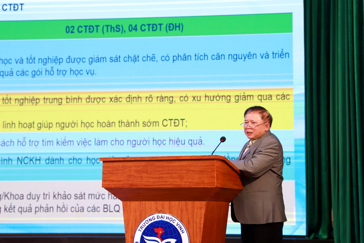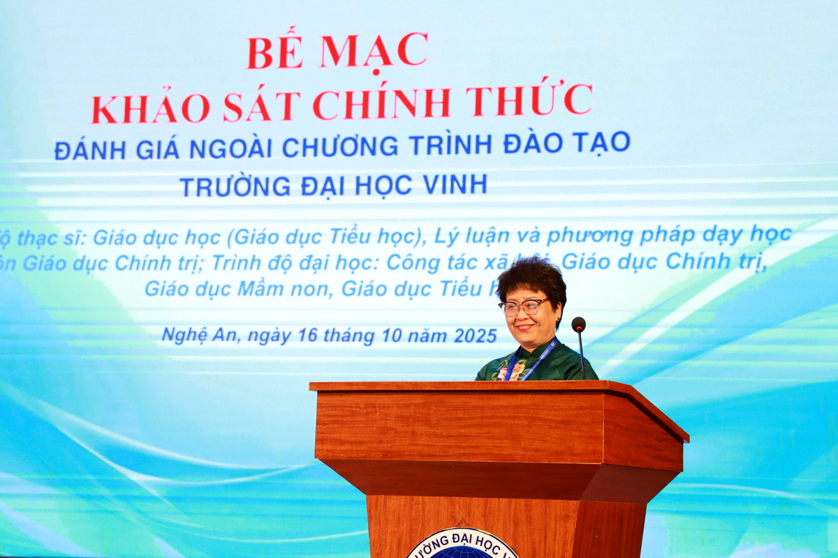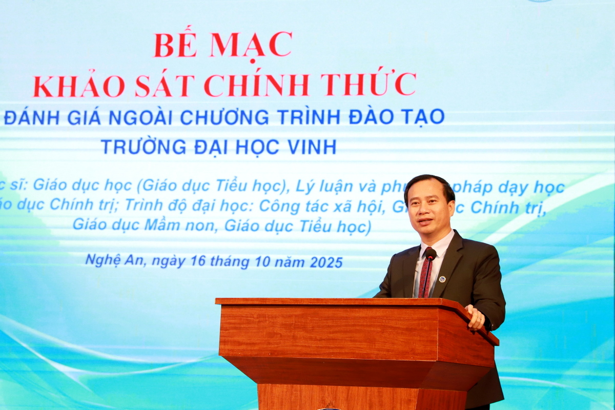 Phát biểu tại lễ bế mạc, GS.TS. Nguyễn Huy Bằng – Hiệu trưởng Trường Đại học Vinh bày tỏ lòng cảm ơn sâu sắc đến Trung tâm Kiểm định chất lượng giáo dục Thăng Long và Đoàn đánh giá ngoài đã làm việc khách quan, khoa học và tâm huyết trong suốt quá trình khảo sát. Thầy khẳng định Nhà trường sẽ nghiêm túc tiếp thu các khuyến nghị để tiếp tục hoàn thiện, phát triển các chương trình đào tạo, hướng tới mô hình đánh giá theo chuẩn đầu ra.