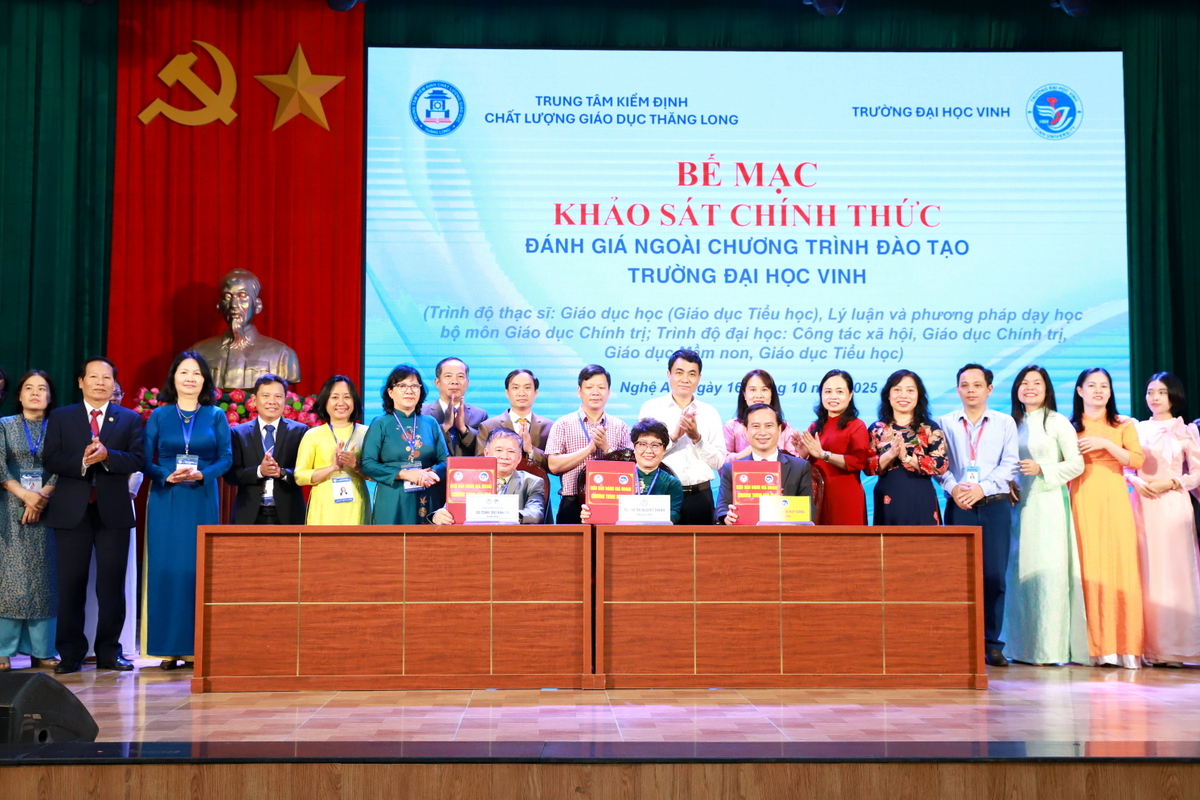 Kết thúc buổi lễ, đại diện ba bên gồm GS.TSKH. Bùi Văn Ga – Trưởng đoàn đánh giá ngoài, TS. Phí Thị Nguyệt Thanh – Phó Giám đốc Trung tâm Kiểm định chất lượng giáo dục Thăng Long, và GS.TS. Nguyễn Huy Bằng – Hiệu trưởng Trường Đại học Vinh đã ký biên bản hoàn thành đợt khảo sát chính thức đánh giá chất lượng 6 chương trình đào tạo.